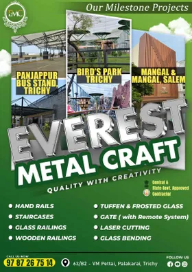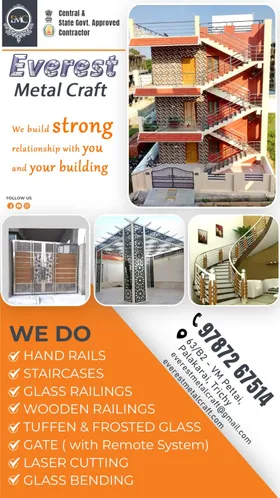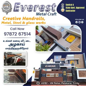 எங்களிடம் அனைத்து வகையான மெட்டல் வேலைகள் கேட், ஸ்டெப், கிளாஸ் பால்கனி, டேபிள், சேர், கட்டில், கேட், டிரஸ், ரோலிங் ஷட்டர், கிரில் வேலைகள் அனைத்தும் சிறந்த முறையில், நியாய விலையில் செய்து தரப்படும்.