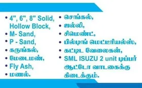 Also, all the construction works will be done in the best manner. SML ISUZU 2 Unit Tipper and Auto available for rent. We are supplying up to about 30 km from Palladam.