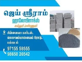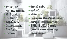 எங்களிடம் 4"/6"/8" Solid & ஹாலோ பிளாக், M -சாண்ட், P - சாண்ட், கருங்கல், மேடை மண், Fly Ash, மணல், செங்கல், ஜல்லி, சிமெண்ட் மற்றும் அனைத்து பில்டிங் மெட்டீரியல் பொருட்களும் மொத்தமாகவும், சில்லறையாகவும் கிடைக்கும்.