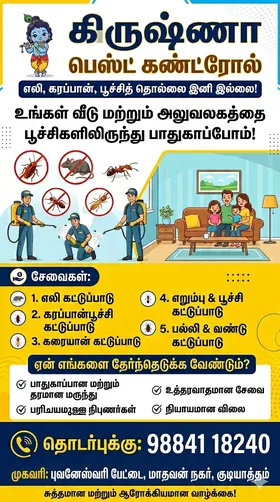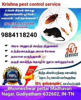 கிருஷ்ணா அவர்களால் நடத்தப்படும் இந்த சேவை உங்கள் வீட்டிலும் அலுவலகத்திலும் பூச்சிகளை அழிக்க உதவுகிறது.
