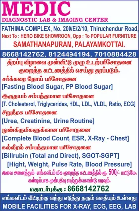 Medic Diagnostic Lab is promoted by Khaja at Tirunelveli. We work hard to provide excellent customer service to all our clients.
