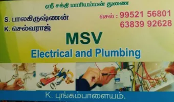 MSV Electrical and Plumbing is promoted by K.Selvaraj at K. Pungampalayam. We work hard to provide excellent customer service to all our clients.