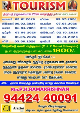 We offer packages such as: 1. Tirupati Tour 2. Tiruvannamalai Girivalam 3. Tiruchendur Tour 4. Sathuragiri Tour 5. Paruvathamalai Tour