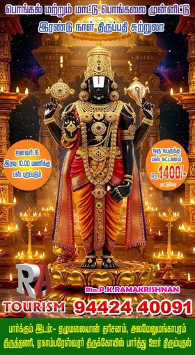 நாங்கள் திருப்பதி ஏழுமலையான் தரிசனம், அலமேலு மங்காபுரம், திருத்தணி, காஞ்சிபுரம் ஏகாம்பரேஸ்வரர் கோயில் போன்ற ஆன்மீக தலங்களுக்கு செல்ல கூடிய சுற்றுலா பயணங்களை மேற்கொள்கிறோம். எங்களிடம் சுற்றுலா தலங்களுக்கு செல்லக்கூடிய அனைத்து ஏற்பாடுகளும் செய்து தரப்படும்.