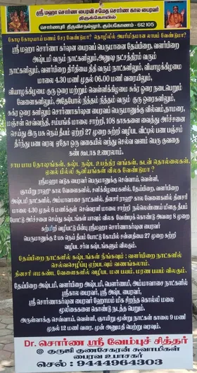 அருள்வாக்கு செவ்வாய், வெள்ளி, ஞாயிறு மூன்று நாட்கள் காலை 9 மணி முதல் 12 மணி வரை. முன் அனுமதி பெற்று வரவும்.