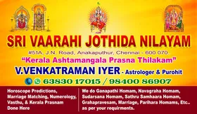 Sri Vaarahi Jothida Nilayam is promoted by V.Venkatraman Iyer at Chennai. We work hard to provide excellent customer service to all our clients.
