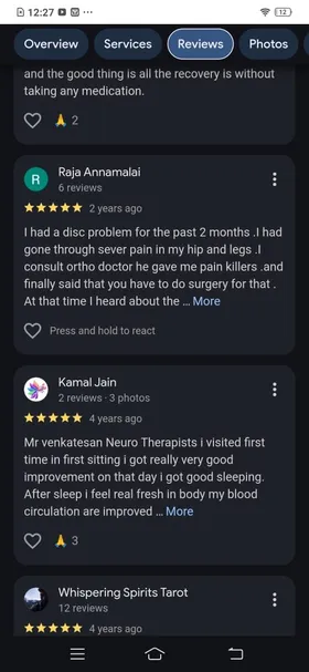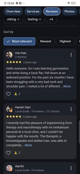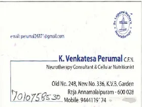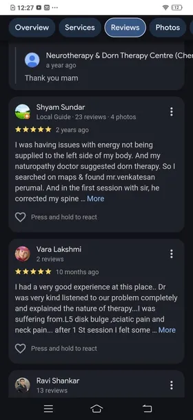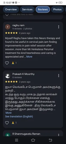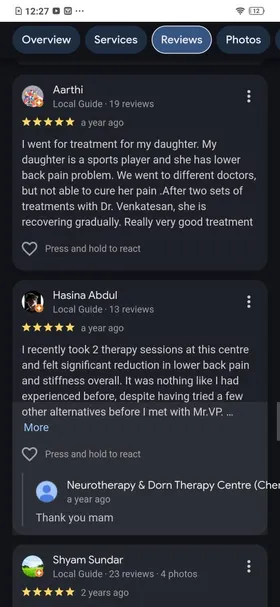 Venkatesa Perumal's area of specialisation is very unique. He mixes his knowledge of neuro, Dorn Therapy, Naturopathy and Verma. I had a frozen shoulder and issues with my L4 & L5 on my spine. I am a Detail